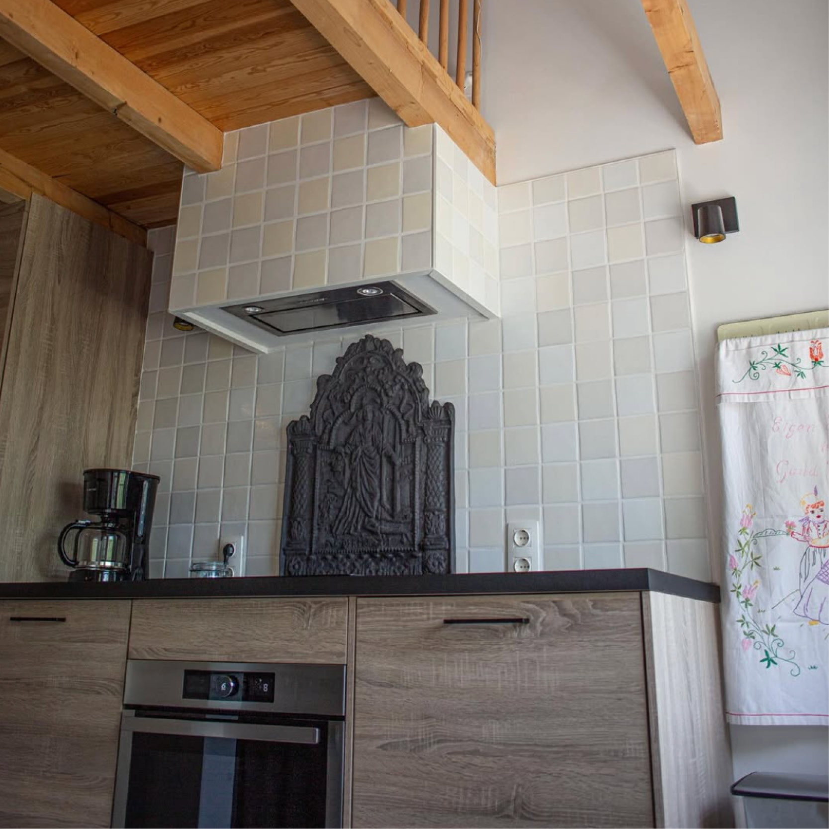 Tegenover het oude aanrecht hebben we een nieuwe aanrecht geplaatst met een vaatwasser, een combi-oven, een inductiekookplaat en een koffiezetapparaat (filters).