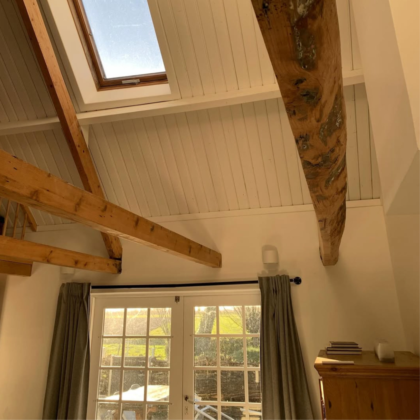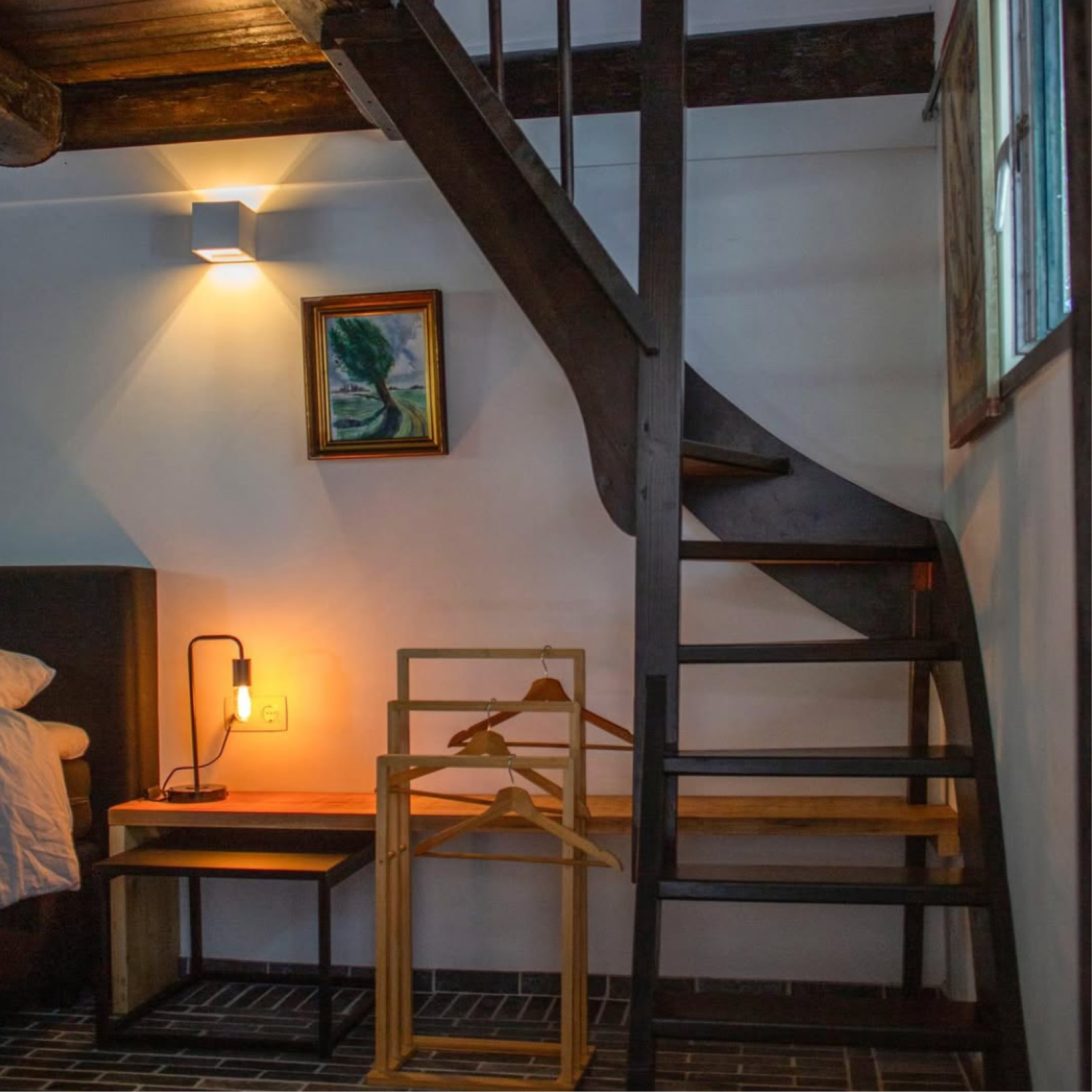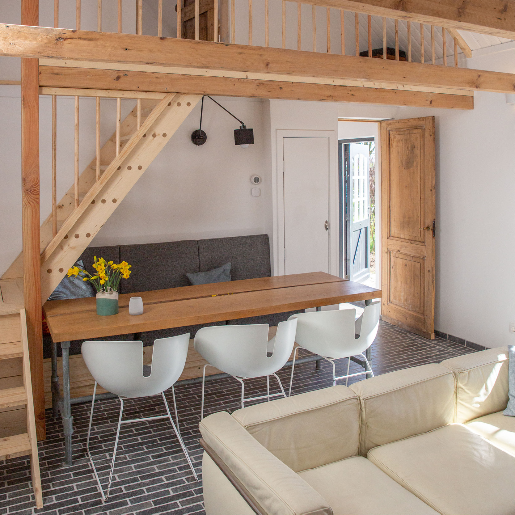 Direct naast de woonkamer was vroeger de varkensstal en het kolenhok. Hier is nu de ouderslaapkamer met een tweepersoonsbed. Hier is ook een trap naar de vide waar nog twee eenpersoonsbedden staan. Indien nodig kunnen we er een babybedje bij zetten. Verder is er boven de keuken nog een vide met slaapkamer met twee bedden.