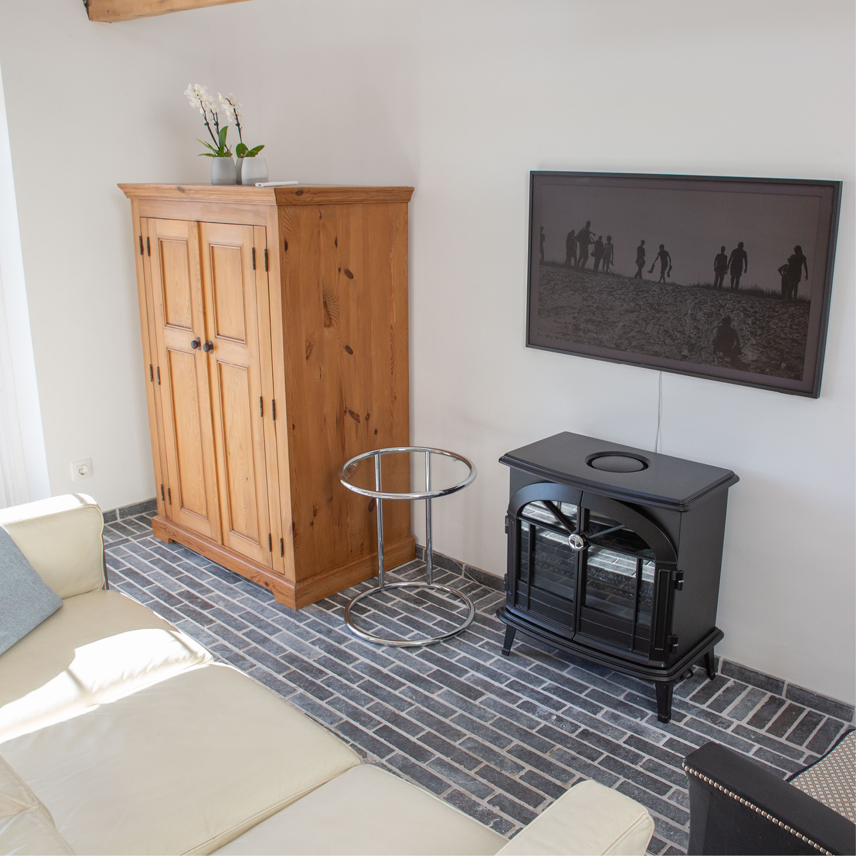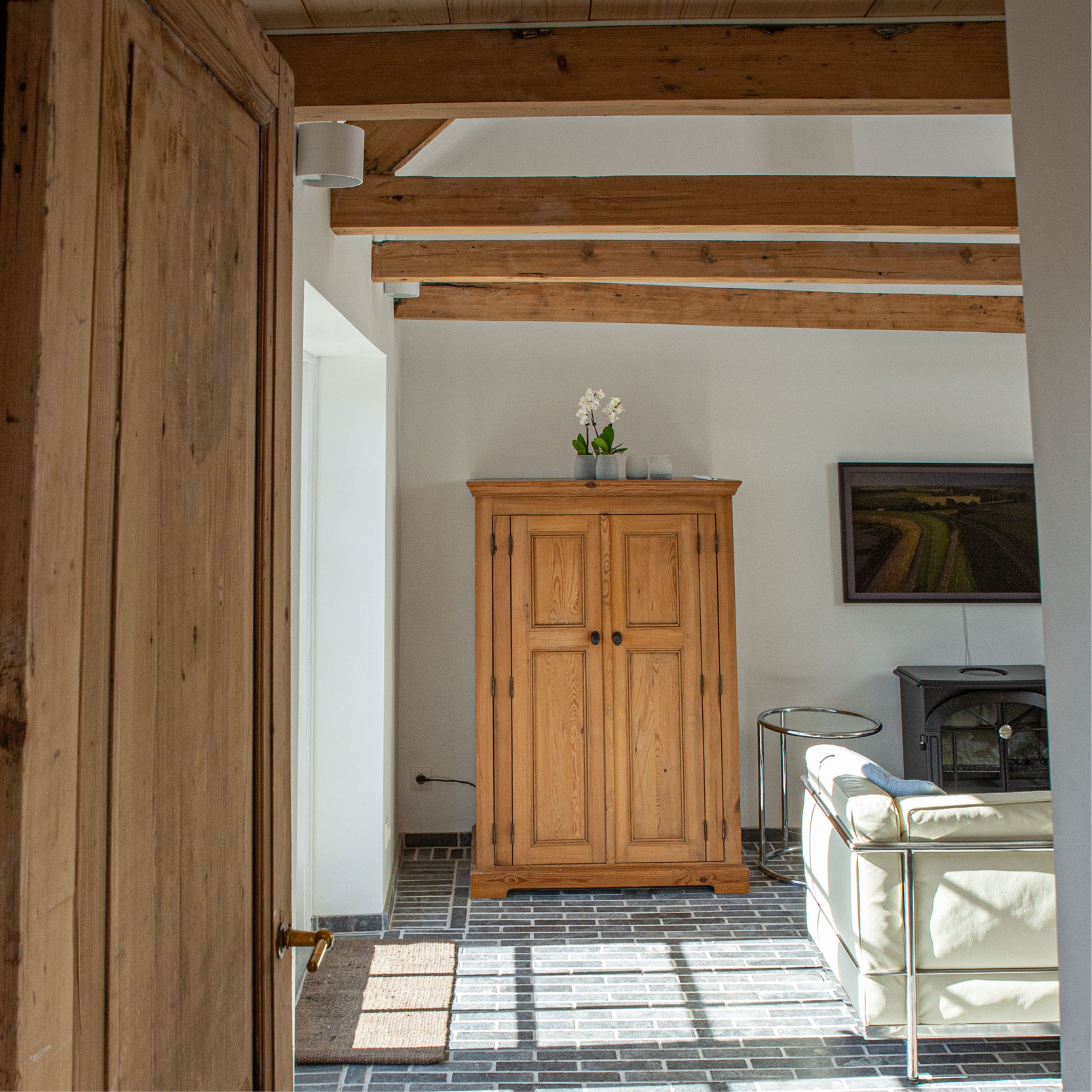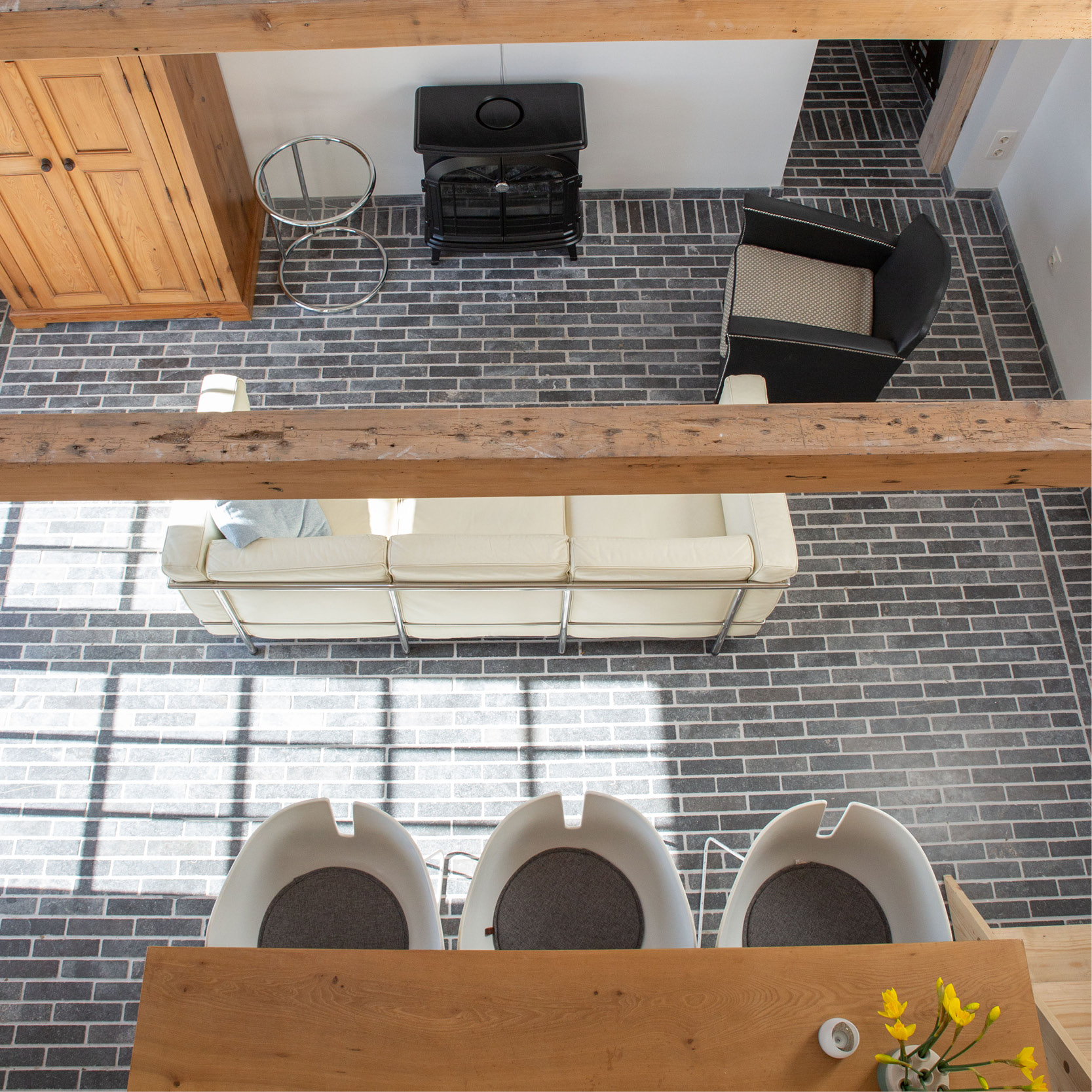 In de woonkamer zijn de oude balken te zien en is de verdiepingsvloer weggehaald voor een ruimtelijk effect. Op de plaats waar vroeger de kachel stond hebben we gekozen voor een sfeerhaard en vloerverwarming. Vanuit de woonkamer kan je via de openslaande deuren de tuin in lopen.